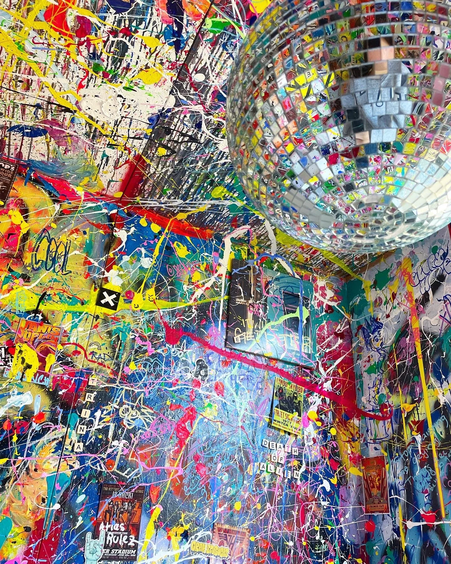A colorful, chaotic room covered in drip and splatter paint, with posters on the walls and a disco ball hanging from the ceiling.