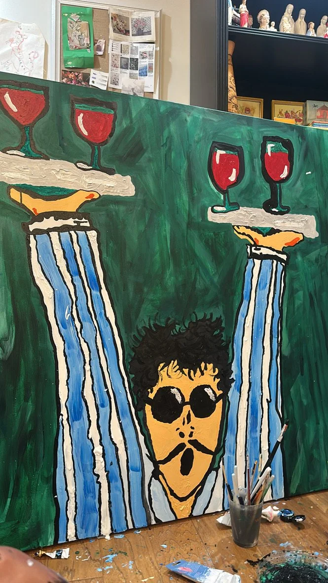 A colorful painting of a person with spiky black hair, wearing round black sunglasses, and a mustache, holding two-handed glasses of red wine in the air. The background is green with two sets of two glasses of red wine on white trays above the person View fullsize