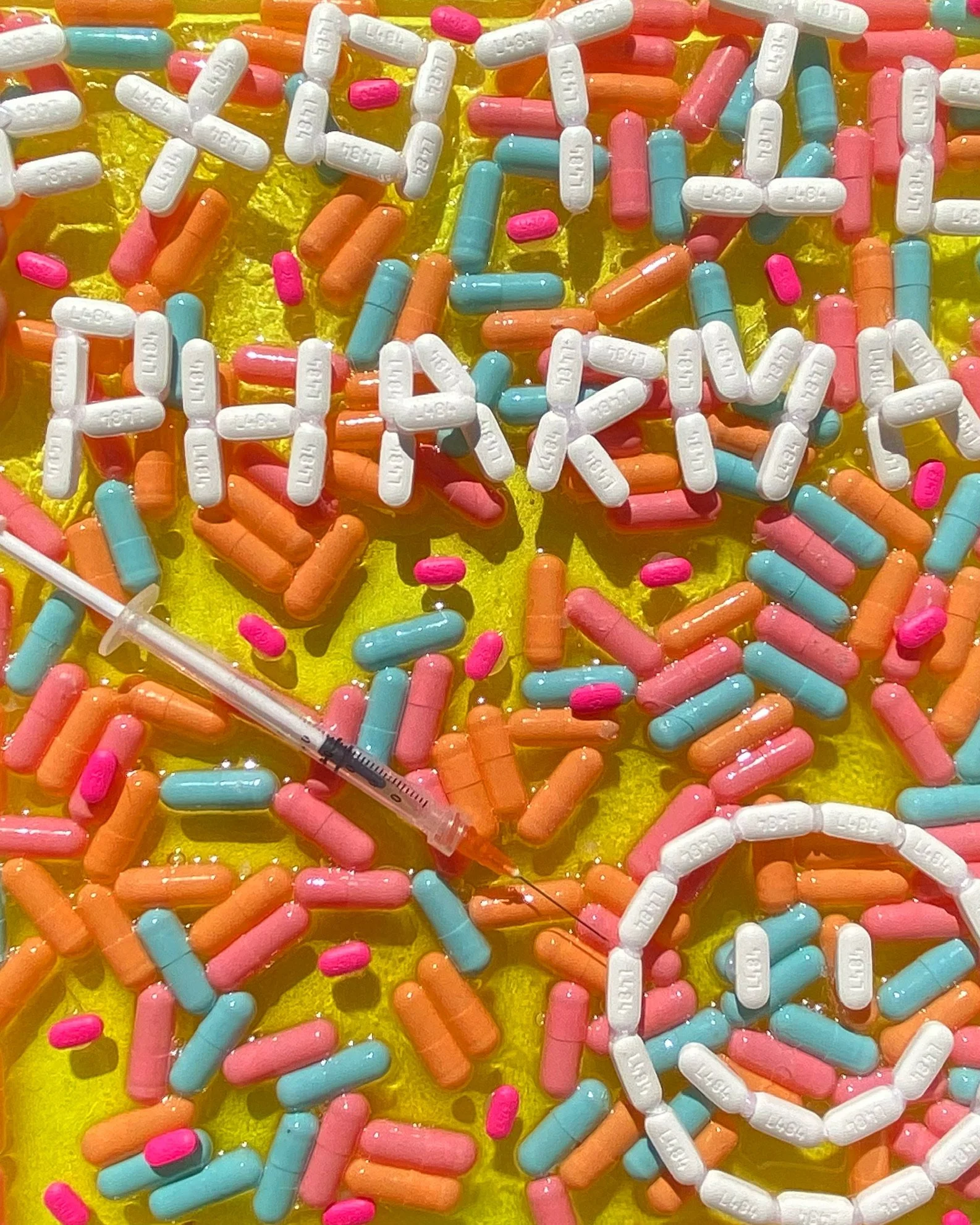 Assorted colorful pills and capsules, some shaped like letters, scattered on a yellow surface with a syringe among them.