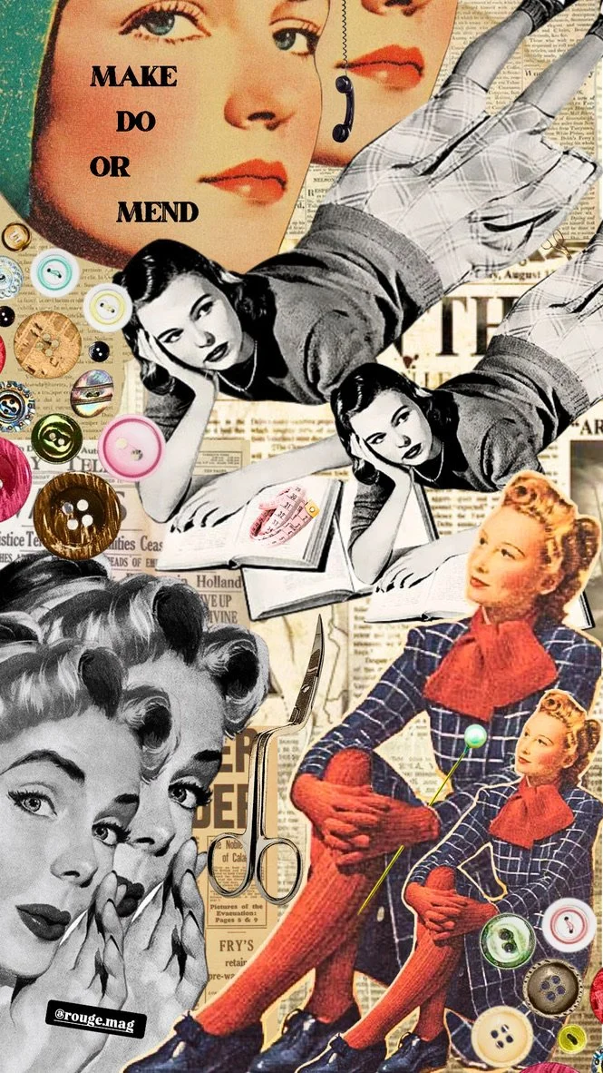 A collage of vintage female magazine illustrations and photographs, including a woman's face with the text "Make Do or Mend," various sewing buttons, scissors, an open book, and images of women in retro clothing, with a mix of black and white and col